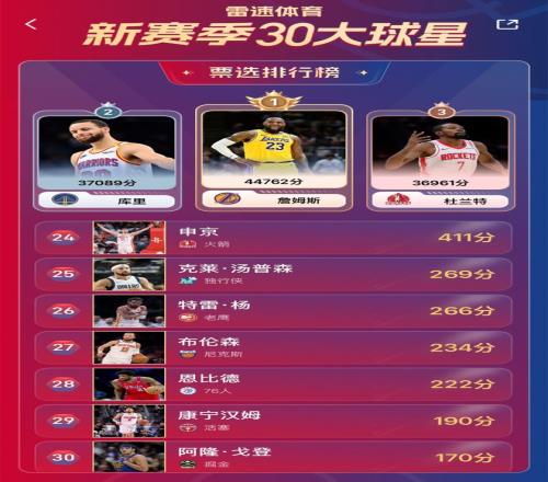 目前雷速NBA新赛季30大球星排名结果如下: