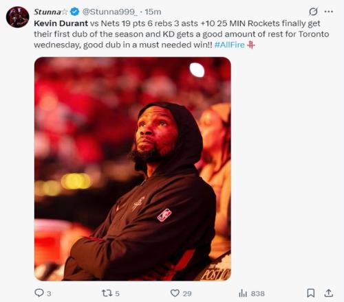 不少美国球迷对于杜兰特三节打卡十分不满,因为他们都希望杜兰特能拿到20+的数据,因为NBA陷入涉赌丑闻中,这些球迷都觉得杜兰特第四节被DNP有球场之外的因素。(但实际上火箭领先30+了没必要上杜兰特)