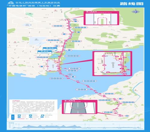十五运会的马拉松赛道是全运会史上首条跨境赛道,起终点均设在深圳湾体育中心旁海德三道。其中深圳段约20.354公里,位于南山区和前海。香港段约21.841公里,位于元朗区。选手们要经深圳湾公园,过深圳湾口岸进入香港,沿港深西部公路至折返点后返程,再经东滨路、前海路等回到终点。