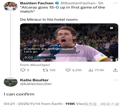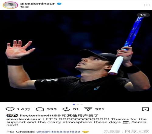 最终,没有意外!阿尔卡拉斯轻松击败穆塞蒂为自己锁定了出线名额,同时也助力德米纳尔晋级年终总决赛四强。赛后,社交媒体上传出了一段趣事,一位网球博主调侃道:“比赛才进行到第一局,阿尔卡拉斯15-0领先穆塞蒂,而德米纳尔已经在酒店房间里激动地为阿尔卡拉斯加油了。”