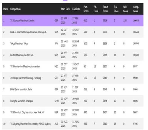 在这一全球顶尖的赛事评价体系中,上海马拉松凭借强大的精英选手阵容与卓越的竞技水平,在“参与分”上获得250分,展现出日益增强的国际吸引力。更令人瞩目的是,赛事在“成绩分”上一举斩获9646分的高分。其中,女子组冠军科斯盖以2小时16分36秒的惊艳成绩,不仅大幅刷新赛会纪录,创下中国境内女子马拉松最快速度,更位列本年度全球女子马拉松成绩第四名。