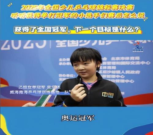 在夺冠之后接受采访,当被问到夺得全国冠军的下一个目标是什么,吴扆依直言不讳:“奥运冠军!”吴扆依的偶像是孙颖莎,今年上半年独自在内蒙古参加比赛,吴扆依接受采访时说了一句话:“孙颖莎在场上都不哭,我在场上怎么能哭呢。”这就是榜样的力量,期待这位心怀远大目标的小朋友在未来继续蜕变!