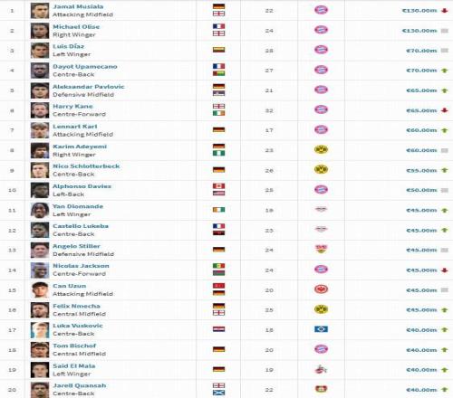 在本次身价更新中,穆西亚拉身价下跌1000万欧至1.3亿欧,与奥利塞并列第一,于帕梅卡诺身价上涨1000万欧至7000万欧与迪亚斯并列第三,凯恩身价下跌1000万至6500万欧,与帕夫洛维奇并列第五,卡尔身价上涨4000万欧至6000万欧。